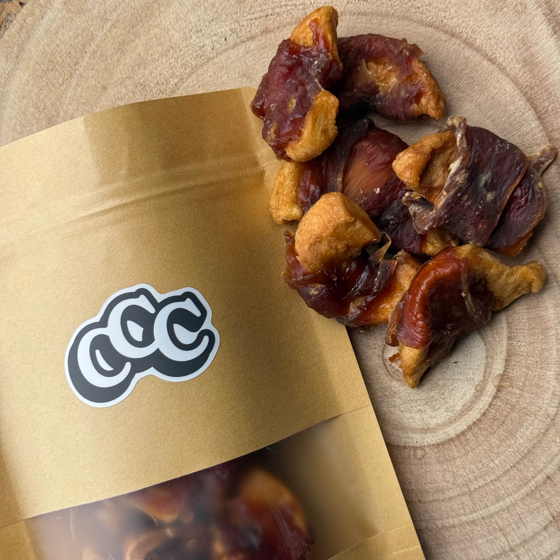 These bite-sized chunks of sweet apple are gently wrapped in strips of lean chicken breast, creating a wholesome reward that's both tasty and nutritious. Packed with protein and fibre, they're perfect for training, snacking, or just because your pup deserves something special.